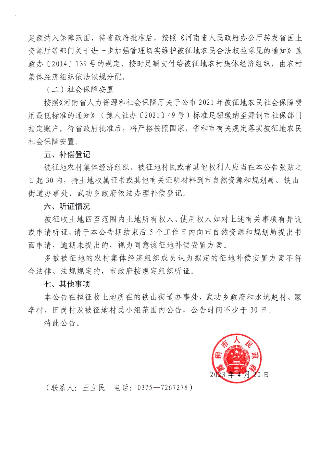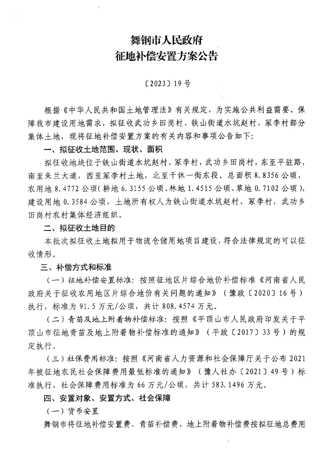舞钢市人民政府征地补偿安置方案公告(铁山街道水坑赵、冢李村,武功乡田岗村)